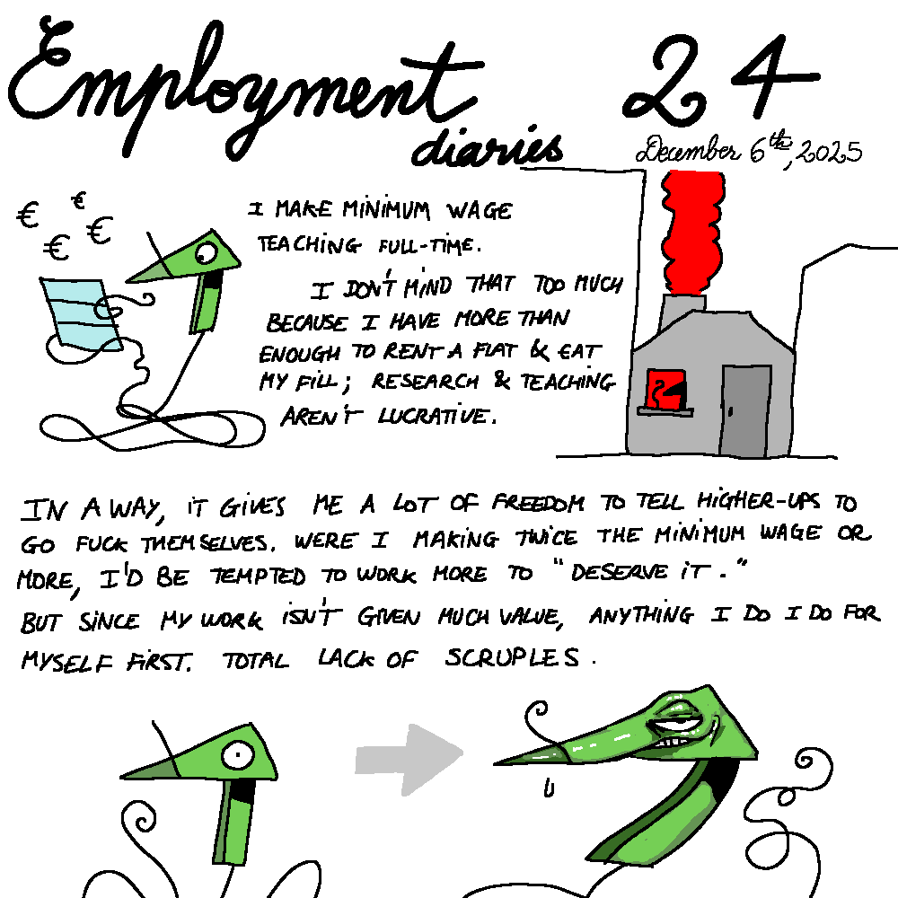 September 24, 2024Even though I am proud of my academic accomplishments, I don't like to mention my studies or diplomas. But I find it bitterly funny that I've got several years of post-high-school studies and yet I can't get a job carrying boxes of books around. No answer even after a phone call! "Yes, we have your application, we'll get back to you soon. Your interest is noted by the way! :)"